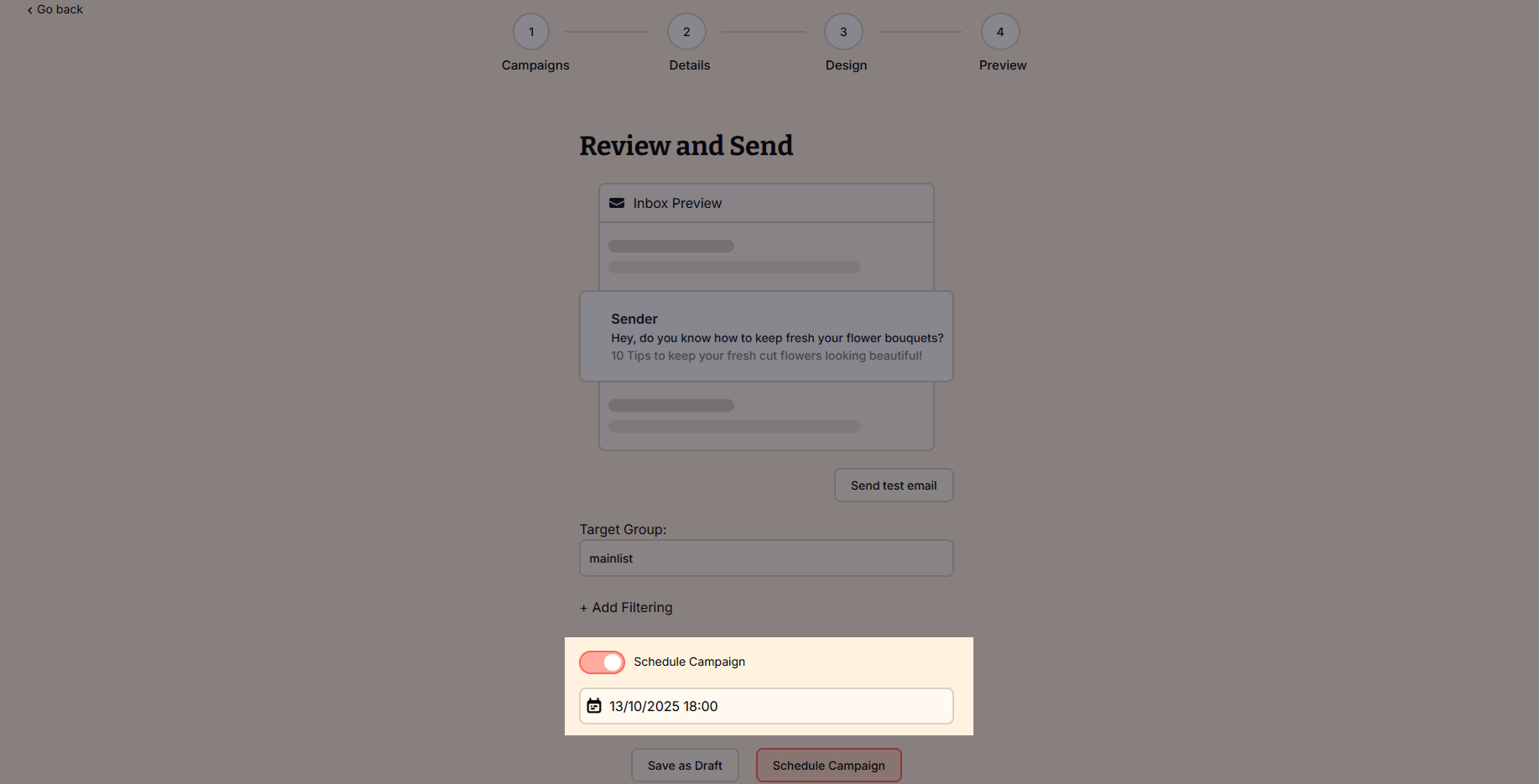 - Send now – Immediately send your campaign