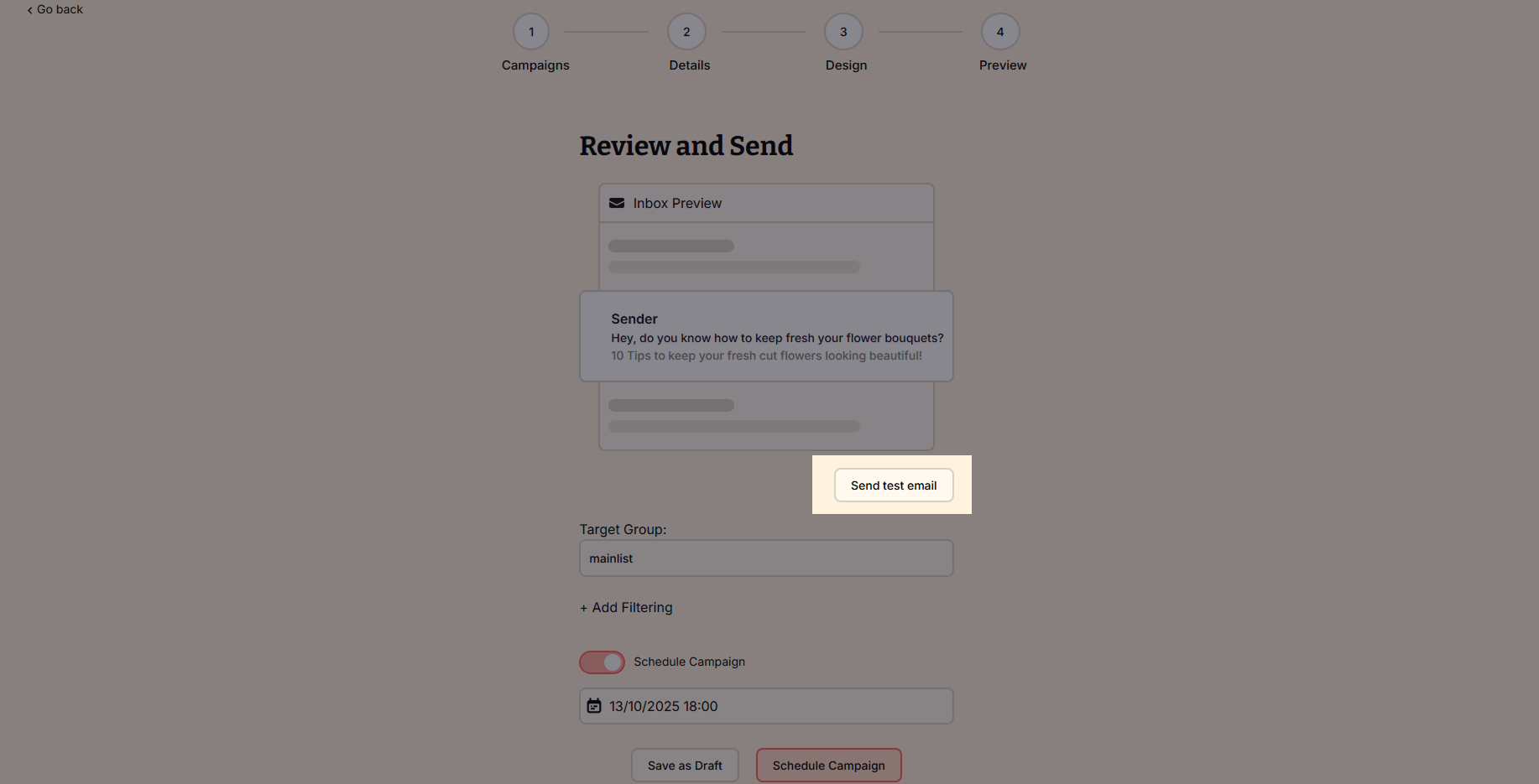 Tip: Before sending or scheduling your campaign, click on the Send Test Mail button to receive the email you’ve created in your inbox and check what your subscribers will receive!